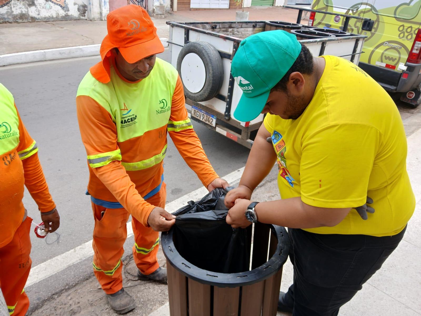 Com o apoio dos jovens aprendizes da Viambiental e Naturalle, a Alurb também reforçou os cuidados com o meio ambiente, ao orientar moradores e visitantes sobre a importância de preservar o espaço público, evitando descarte irregular e informando sobre os serviços disponibilizados pela Prefeitura de Maceió para o descarte correto de resíduos.