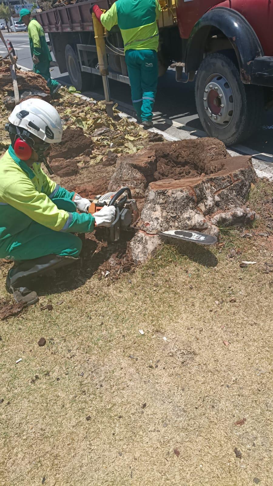 Amendoeira foi atingida por um caminhão e apresentava risco de queda