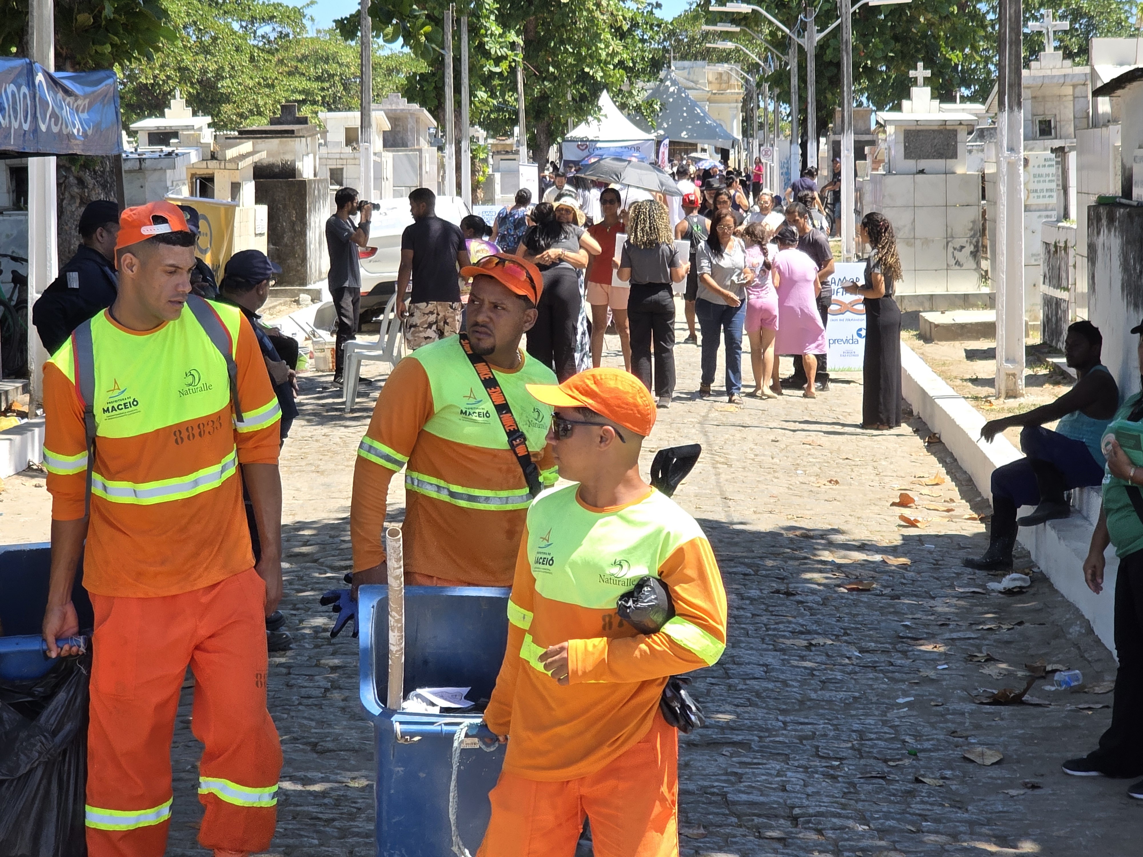 Durante todo o feriado, agentes de limpeza da Alurb percorreram os campos-santos fazendo a limpeza de itens deixados pelos visitantes e mantendo a organização do local. A Autarquia também ofereceu missas, cultos, vitórias e atendimento espiritual, para quem visitou o jazigo de seu ente querido. Todo o movimento dos principais campos santos foi acompanhado pela Guarda Municipal de Maceió.