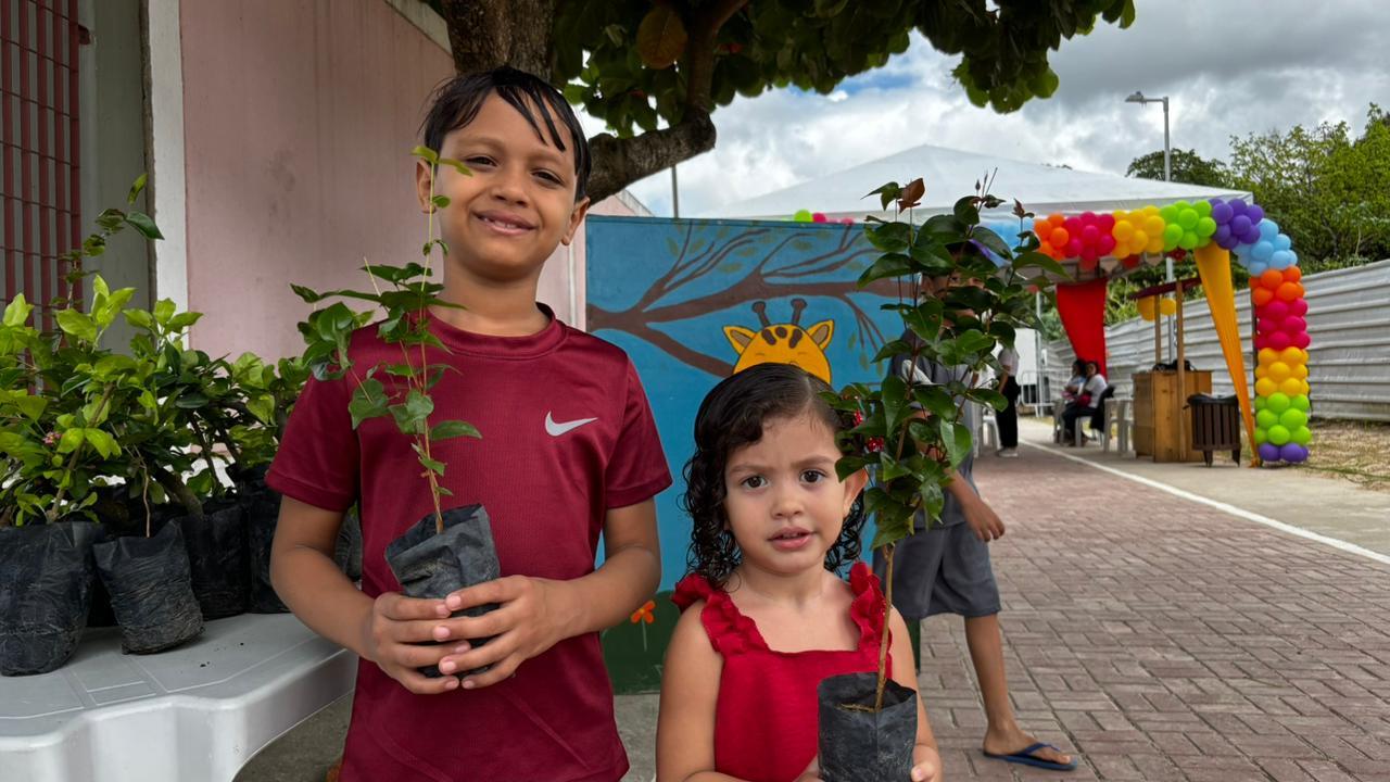 Davi José, de 7 anos, e sua irmã, Ágata Maria, de 4 anos, garantiram suas mudas para arborizar sua casa.