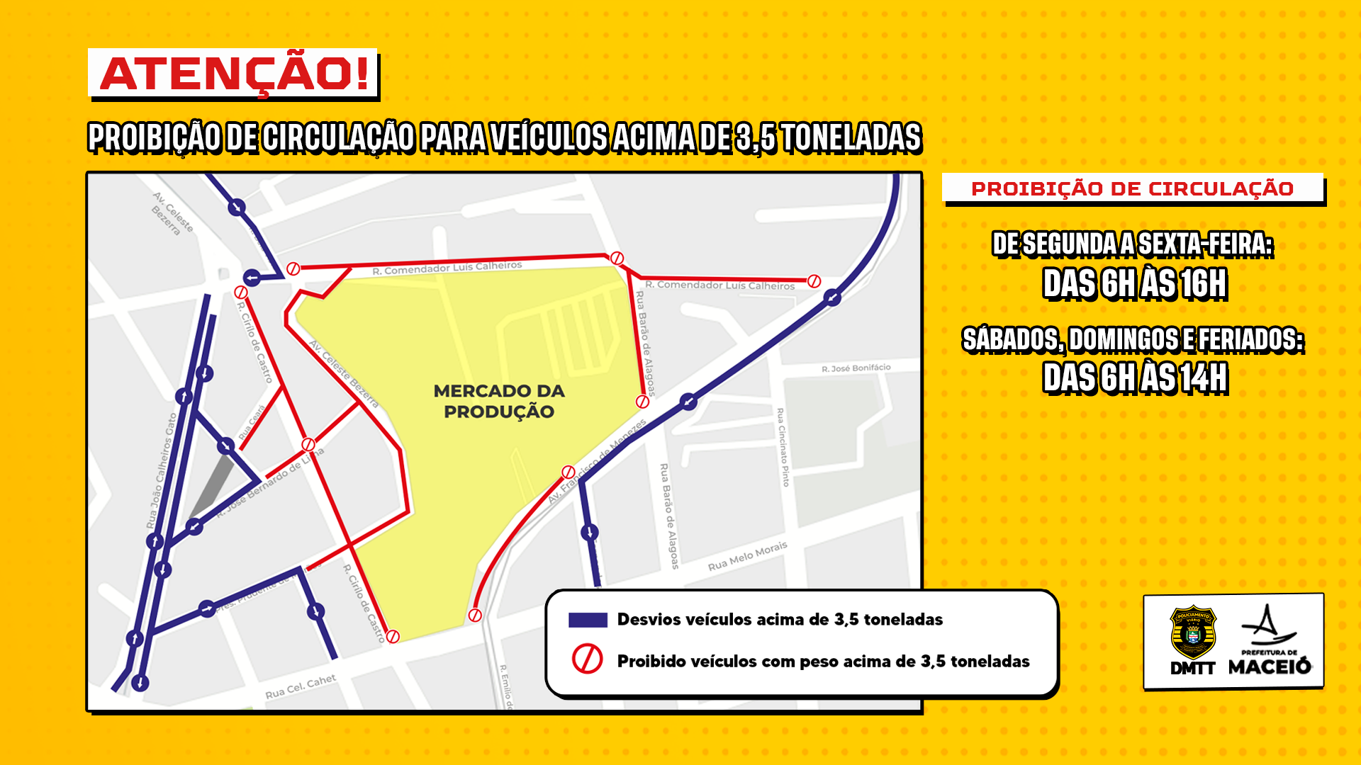 O Departamento Municipal de Transportes e Trânsito (DMTT) instituiu a restrição de circulação de veículos com peso bruto total acima de 3,5 toneladas nas vias localizadas no entorno do Mercado da Produção, em Maceió. A medida foi publicada na edição desta quinta-feira (22) do Diário Oficial Eletrônico de Maceió (DOEM). A restrição passa a valer de segunda a sexta-feira, das 6h às 16h e aos sábados, domingos e feriados, das 6h às 14h.