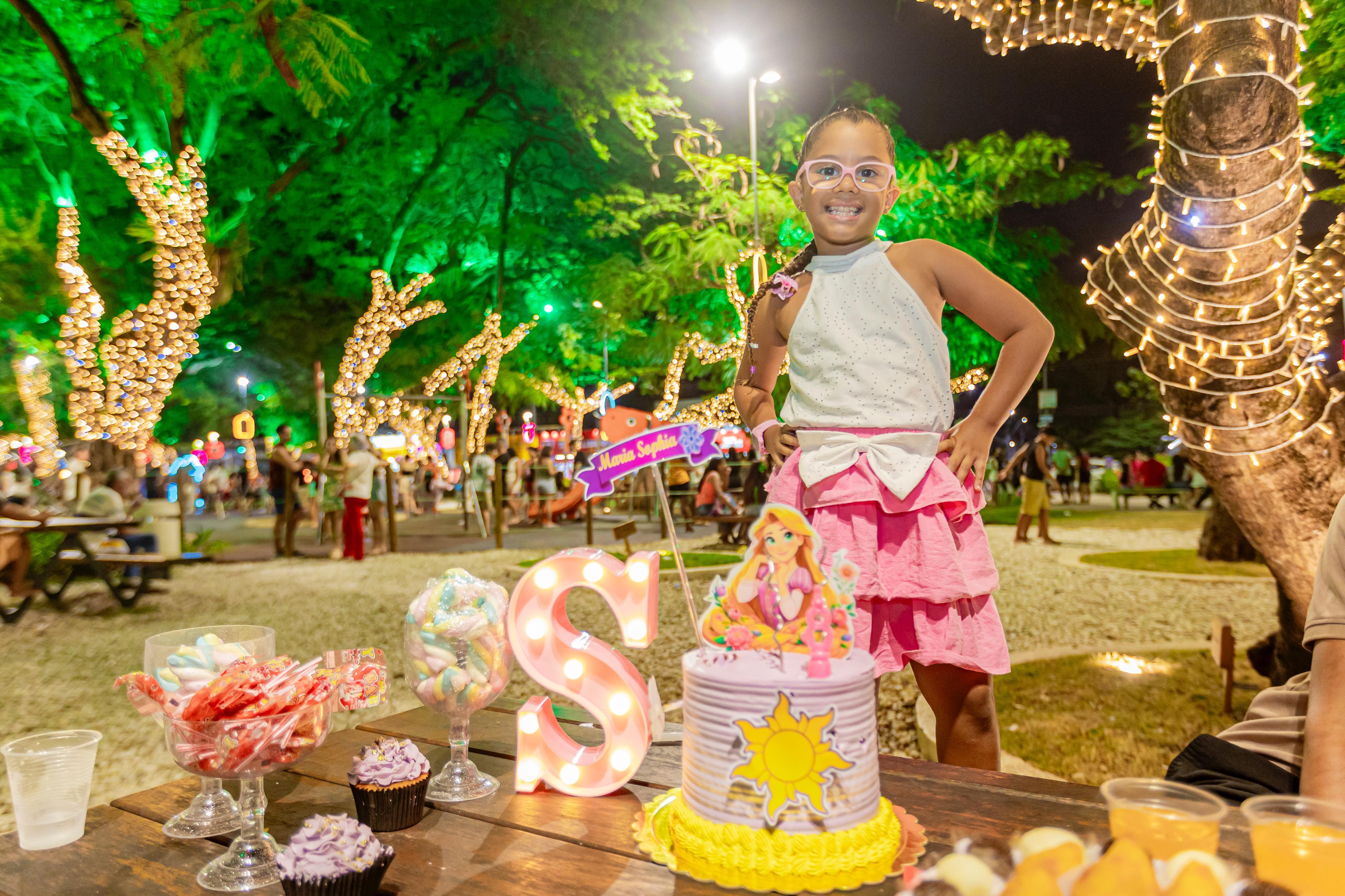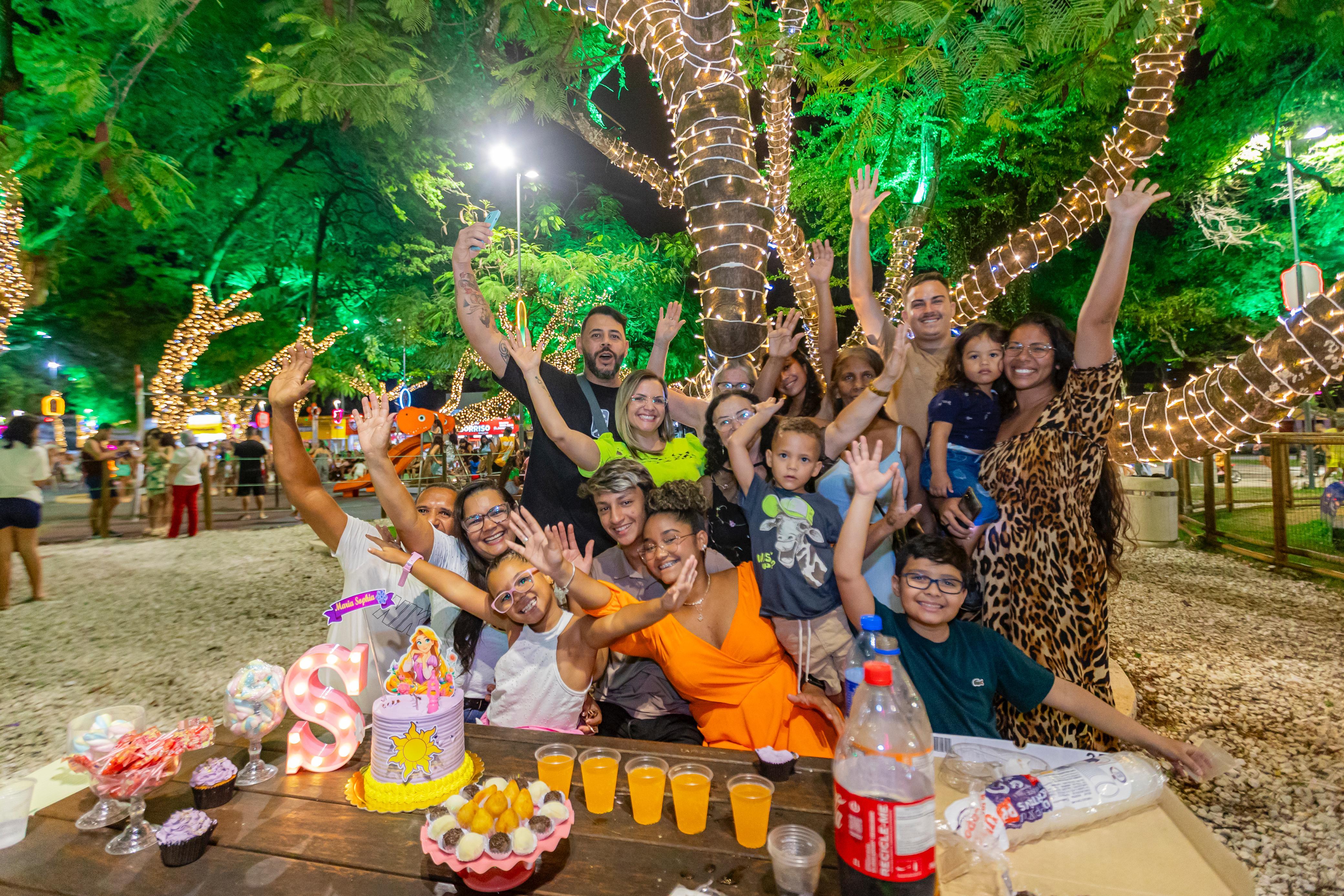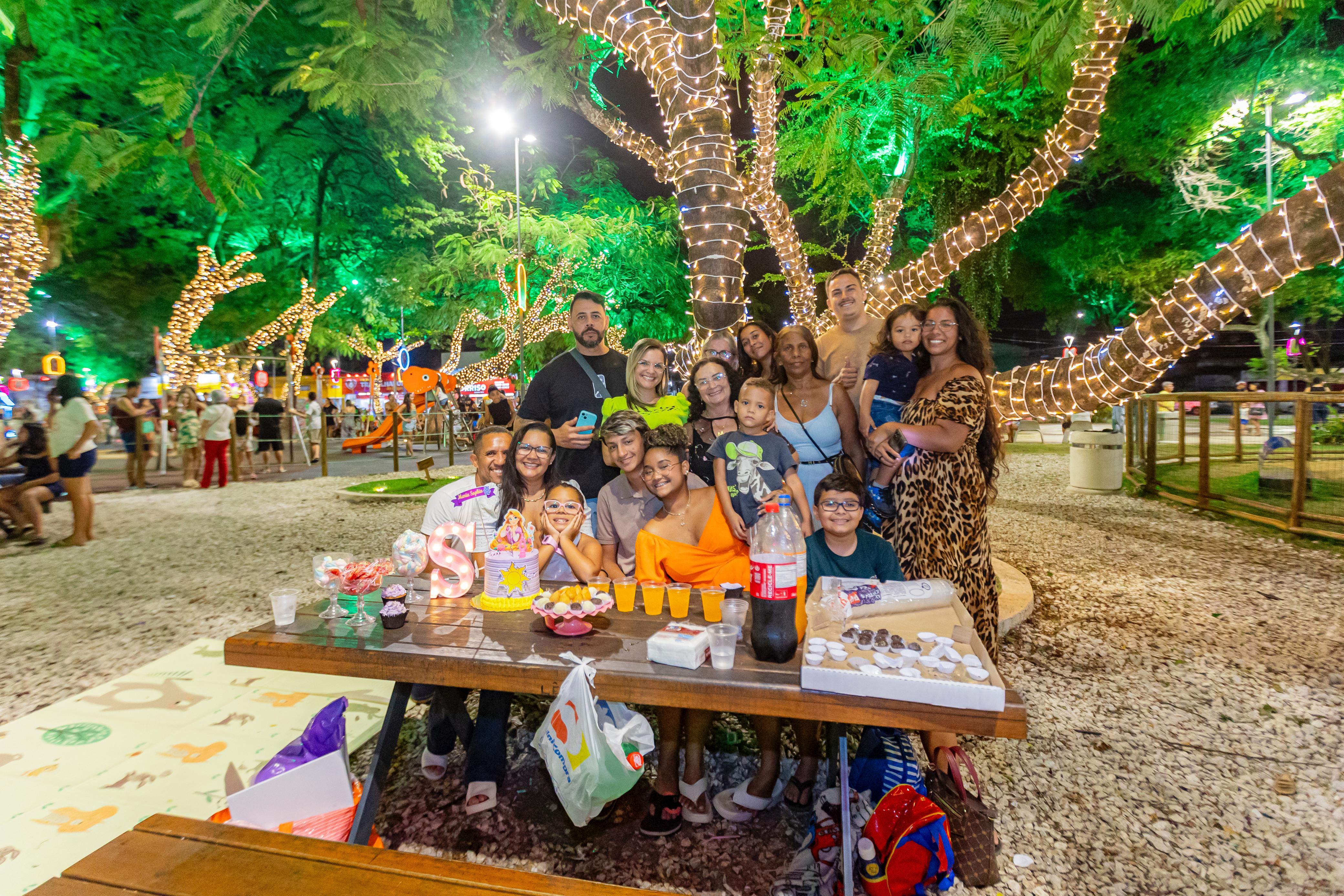Em cima da mesa de madeira, a imagem de uma princesa adornava o bolo colorido, acompanhado de coxinhas, docinhos e refrigerantes, como pede toda boa festa de aniversário. Ao redor, a família reunida sorria, tirava selfies e entoava um animado “parabéns pra você” que ecoava entre as árvores iluminadas e brinquedos do Parque Centenário. No coração de Maceió, o espaço, decorado com elementos infantis para a Vila Encantada da Prefeitura de Maceió, virou cenário de celebrações e momentos de união e afeto.
