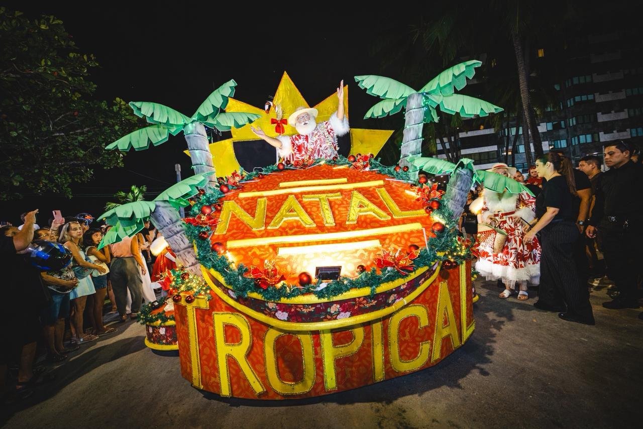 Ao longo da orla marítima, também é possível ver as oito árvores luminosas, presépios iluminados, túneis de luz, painéis fotográficos e elementos marítimos — peixes translúcidos, corais, estrelas-do-mar e até um Papai Noel tropical de três metros segurando uma prancha de surf.