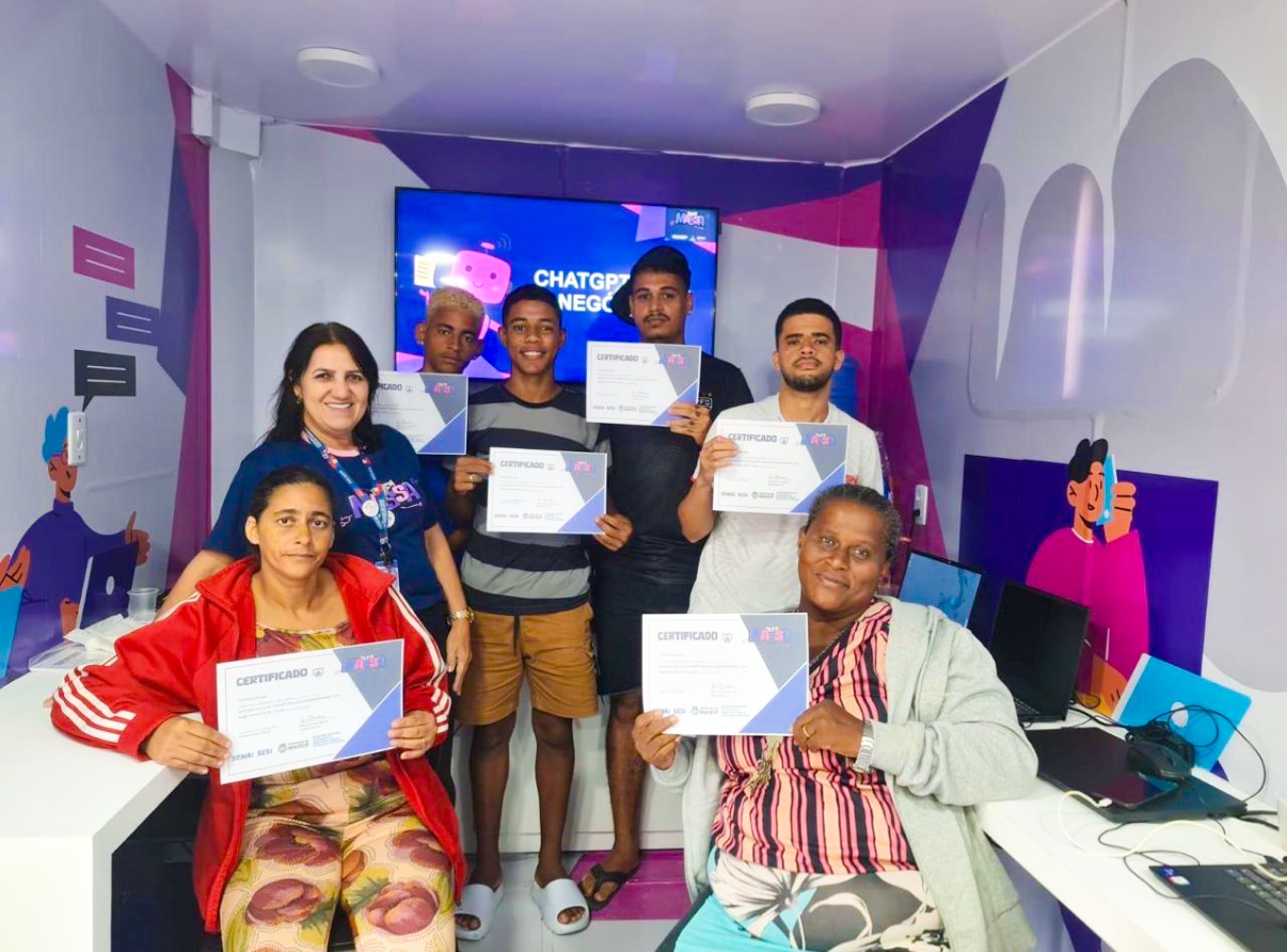As unidades móveis oferecem oficinas como Canva, Pacote Office, Inteligência Artificial para Negócios, Informática para o Primeiro Emprego e Empreendedorismo. Para participar, basta apresentar um documento oficial com foto.