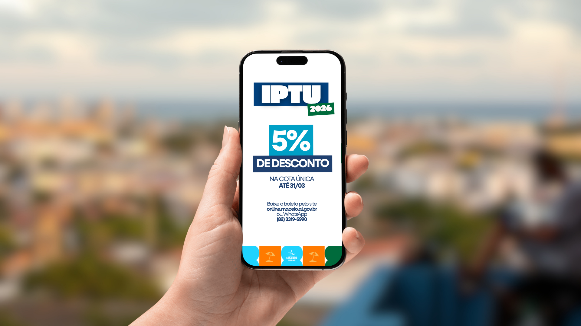 Os maceioenses que ainda não quitaram o IPTU 2026 têm uma nova oportunidade de pagar o tributo com 5% de desconto em cota única até o dia 31 de março. Os boletos em cota única ou parcelado, sem desconto, podem ser emitidos pelos canais oficiais da Secretaria Municipal de Fazenda (Sefaz), como o WhatsApp, pelo número(82) 3312-5990 e pelo site online.maceio.al.gov.br.