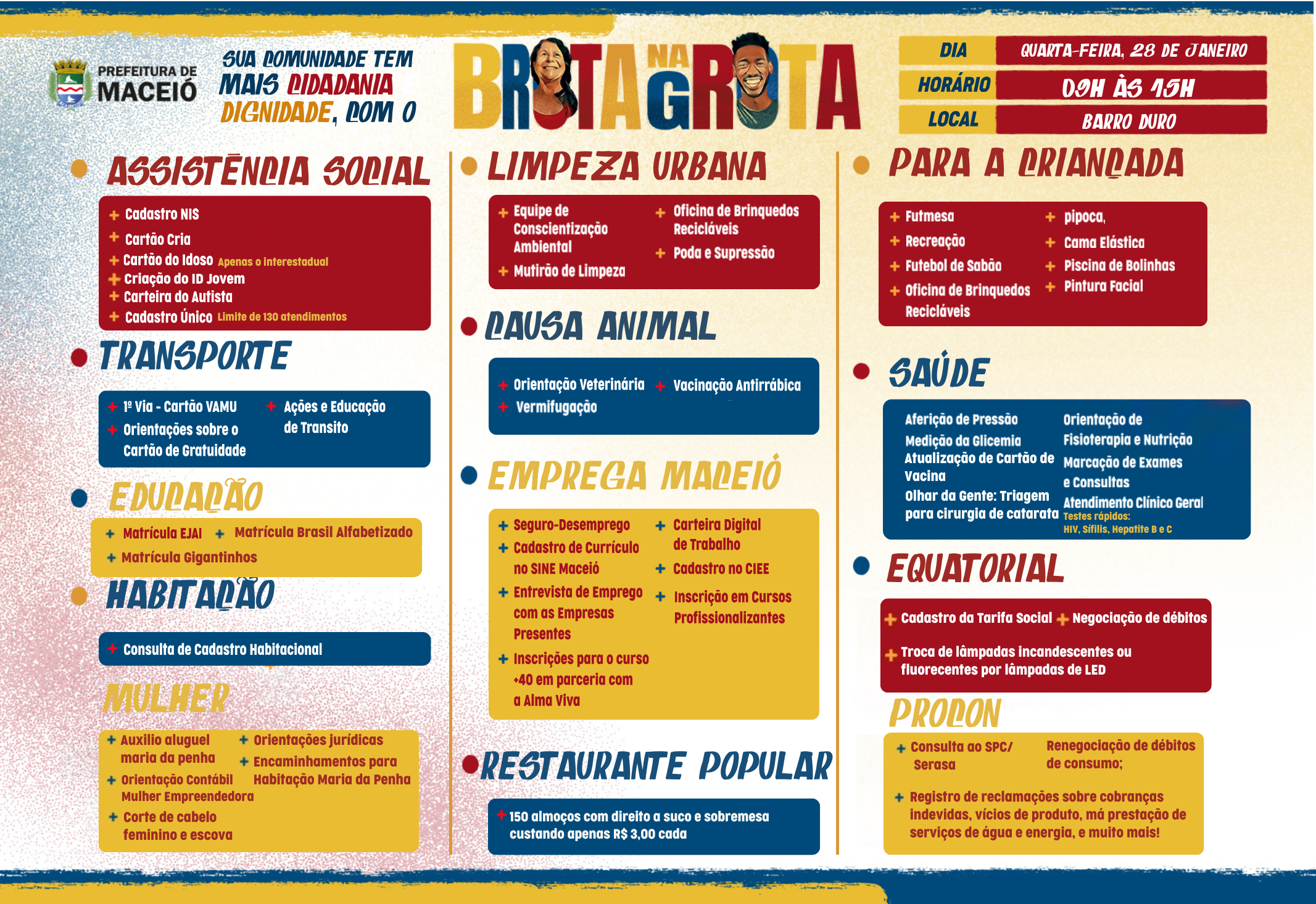 Nesta quarta-feira (28), a Prefeitura de Maceió realiza mais uma edição do programa Brota na Grota, agora ao terminal do Novo Mundo, localizado no bairro do Barro Duro, das 9h às 15h. A ação oferece diversos serviços gratuitos, levando cidadania, inclusão social e inovação aos moradores da região.