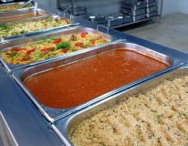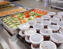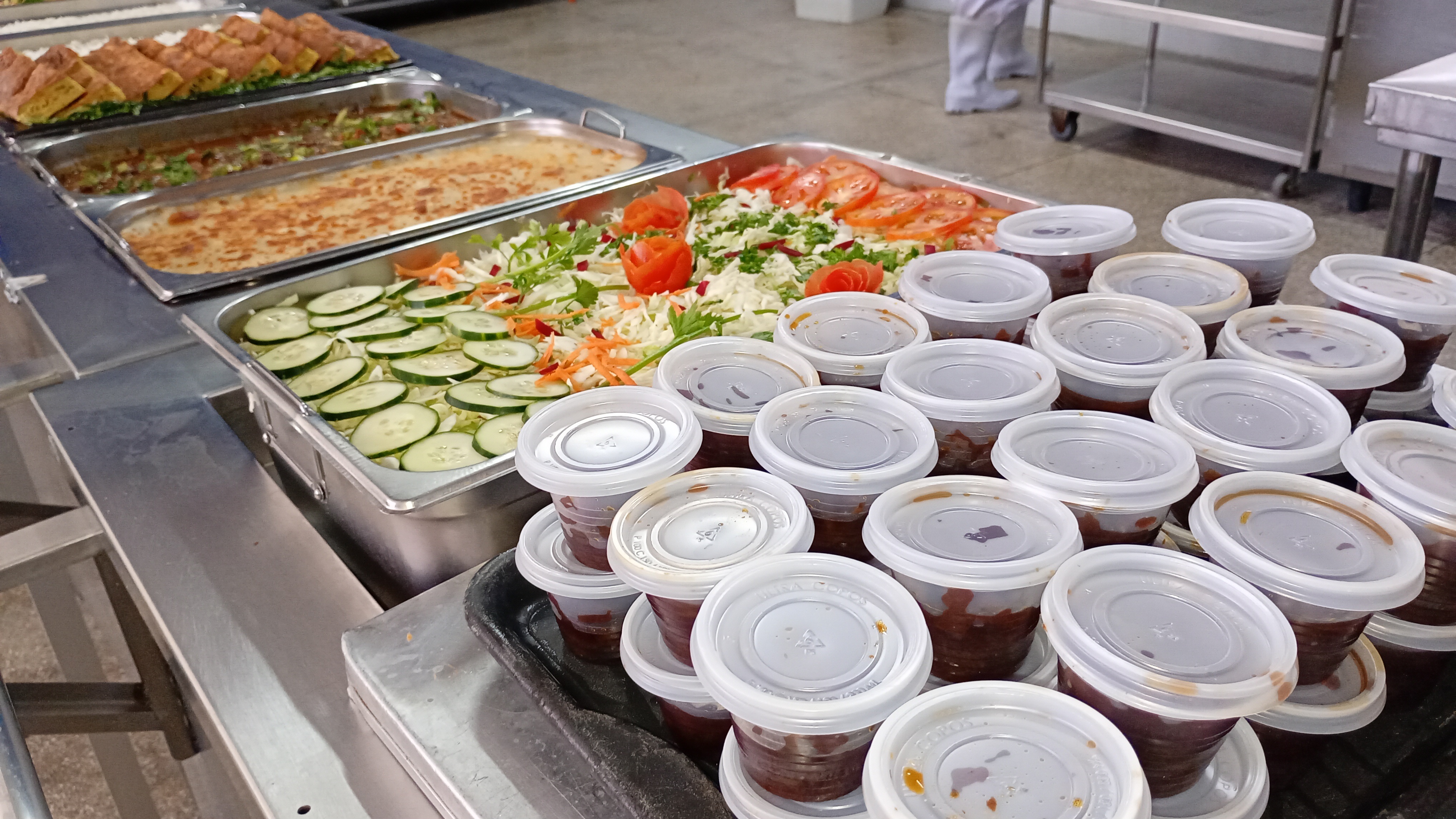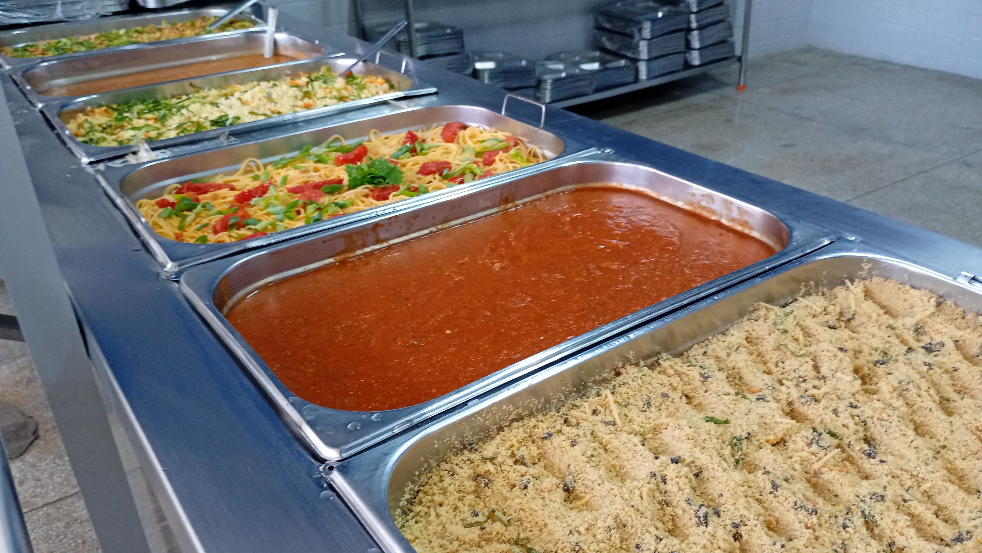 A equipe da cozinha preparou feijão tropeiro e caseiro, arroz refogado com talo e cenoura, macarrão ao molho de tomate, farofa colorida, picadinho de carne, escondidinho de frango, fritada de legumes, salada, doce da casca de melancia e suco de mango. Tudo muito colorido e saboroso.