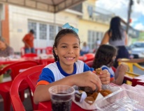 De forma espontânea e divertida, a estudante Marina Dias Silva Santos, da Escola Municipal Nosso Lar I, contou como foi surpreendida com o convite para participar da atividade: “Do nada, me chamaram, eu nem sabia pra onde a gente ia. Depois me disseram que a gente vinha pro Bar do Tonho. Quando cheguei aqui e vi as lembrancinhas das crianças, fiquei muito feliz”.