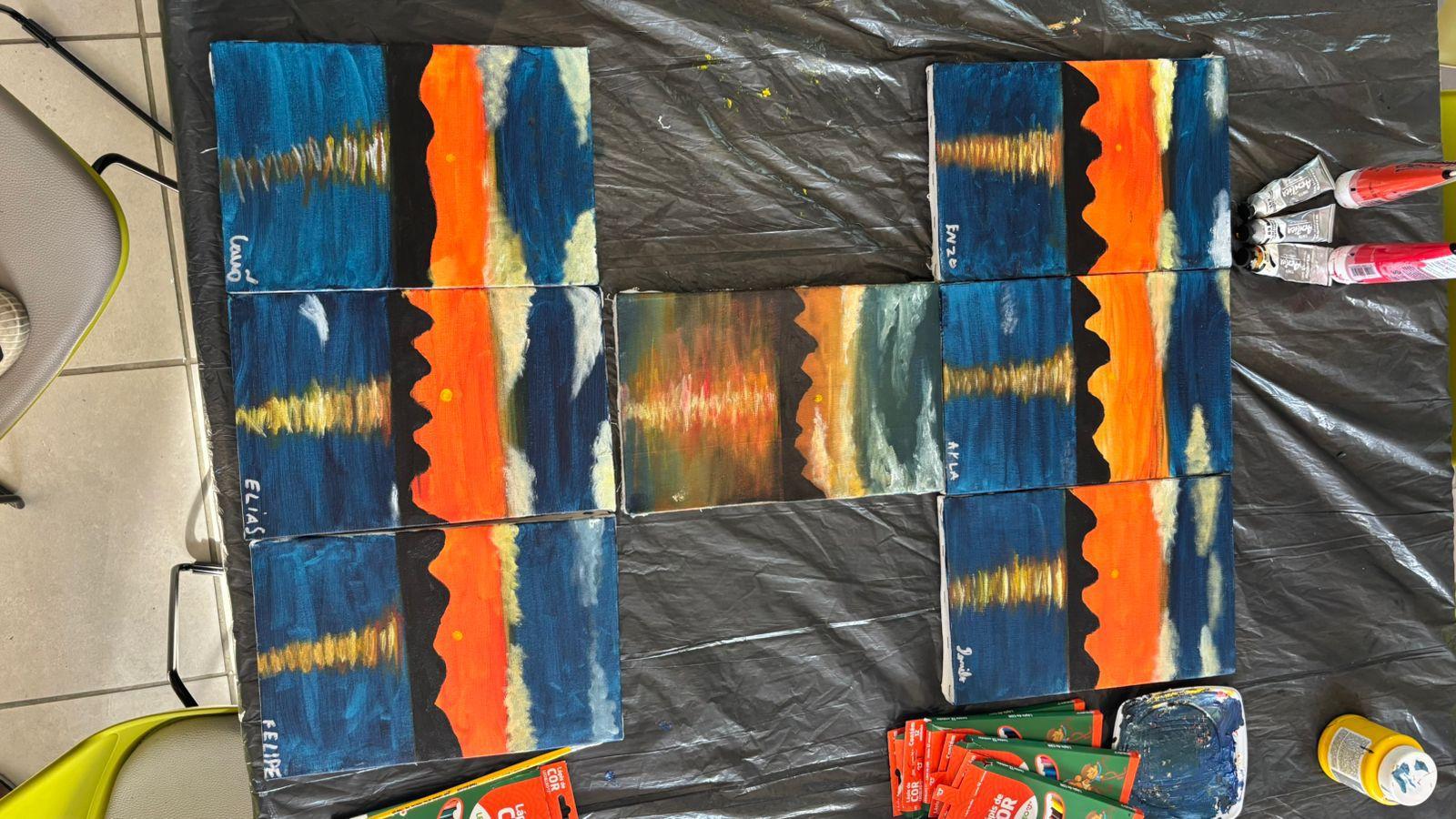 Crianças do Parque Biblioteca produzem telas inspiradas no pôr do sol da lagoa Mundaú