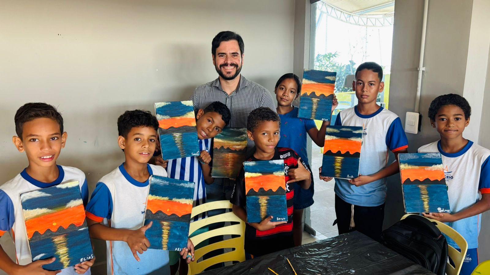 Uma das oficinas foi ministrada pelo artista plástico convidado, Theo Gama. Ele trabalhou com as turmas telas inspiradas no pôr do sol na Lagoa Mundaú, paisagem profundamente conectada à identidade visual e afetiva de Maceió, com técnicas de horizonte, reflexo na água, sobreposição de camadas e criação de planos, sempre valorizando o olhar pessoal dos pequenos artistas.
