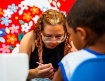 Os gigantinhos também participaram de oficinas criativas, como pintura facial, escultura de balões e contação de histórias, que foram oferecidas pelo Grupo Editorial Triz. O momento também contou com as apresentações musicais do grupo Educanto, da Semed, que animou o público com canções e performances lúdicas.
