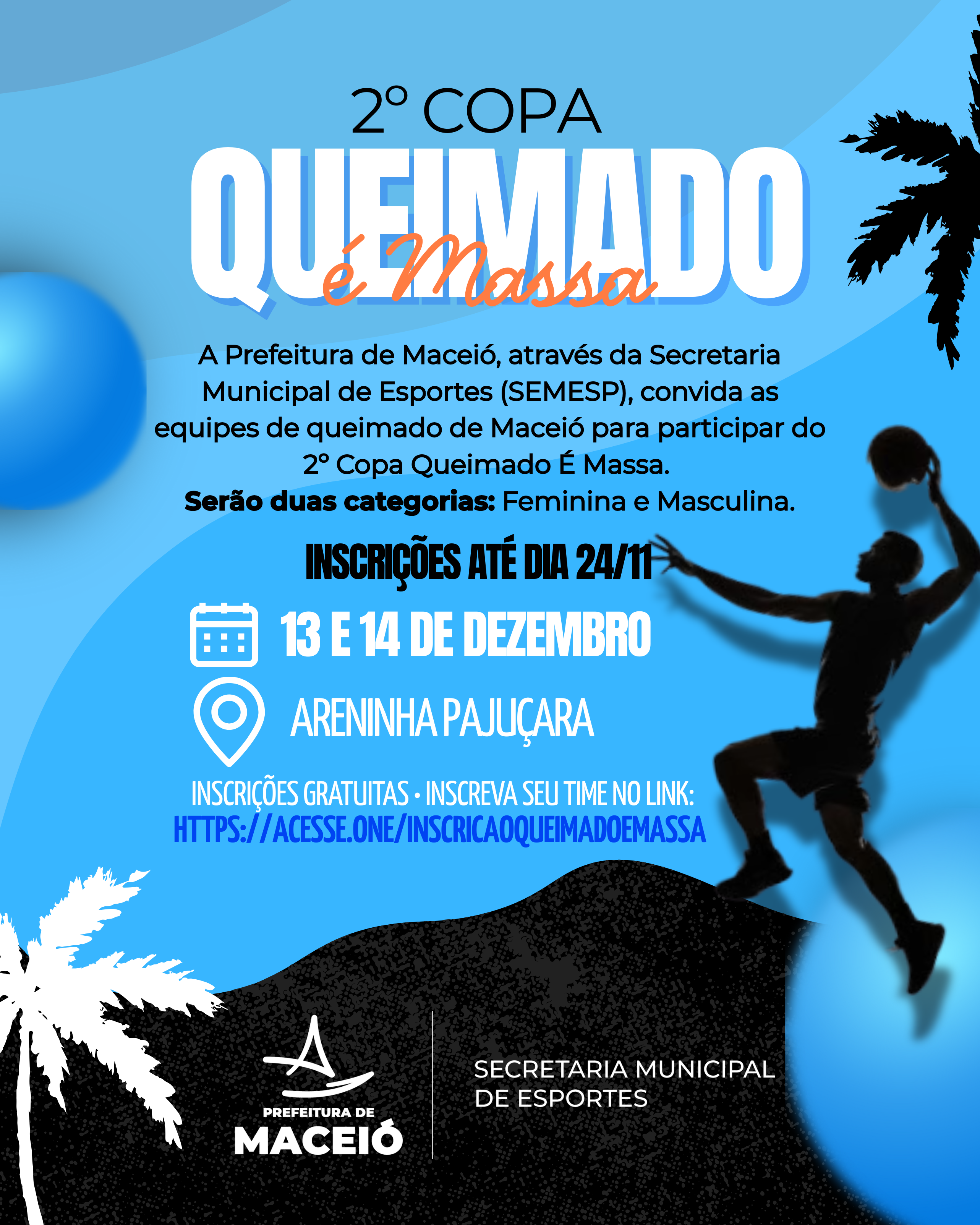 A Secretaria Municipal de Esportes de Maceió (Semesp) vai realizar, nos dias 13 e 14 de dezembro, a 2ª Copa “Queimado é Massa”. O evento, que contará com as categorias masculina e feminina, será realizado a partir das 8h, na Areninha da Pajuçara.