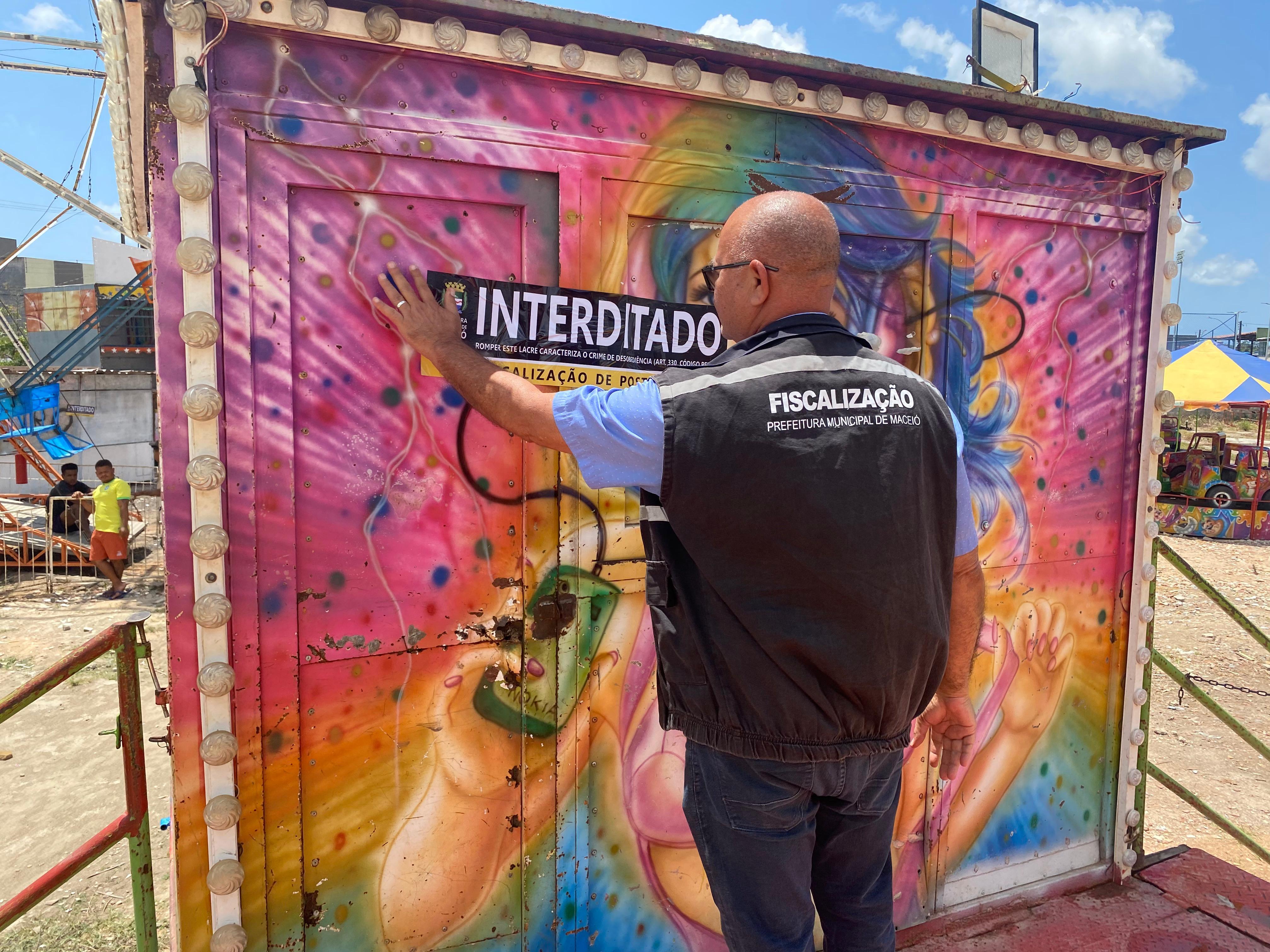 A Secretaria Municipal de Segurança Cidadã (Semsc), por meio da Fiscalização de Posturas, interditou, nesta quarta-feira (15), um parque de diversões que funcionava sem alvará na parte alta de Maceió. Os responsáveis haviam sido notificados no dia 10 de outubro, mas continuaram com as atividades.