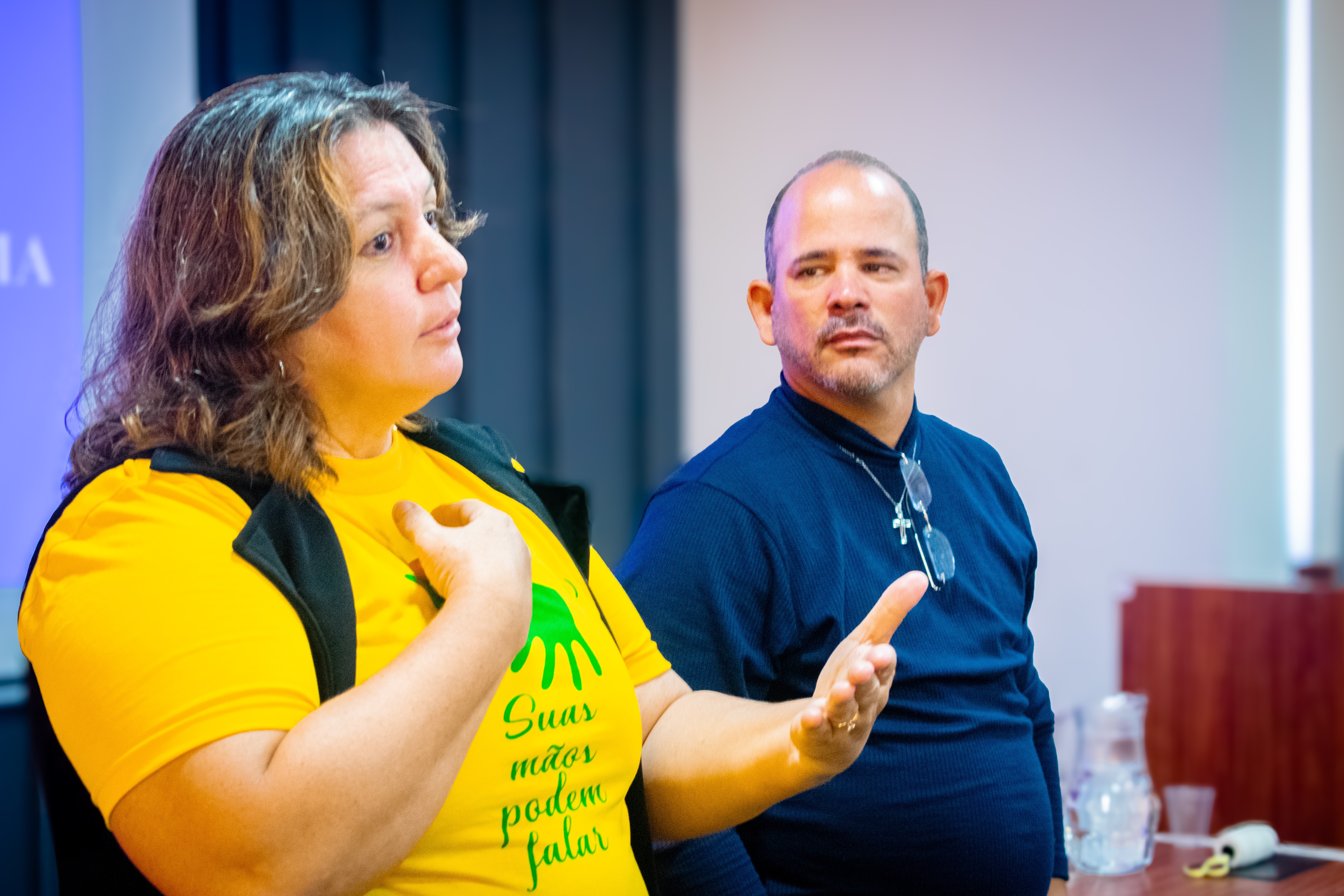 A palestra foi conduzida por Gilmara Farias, intérprete de Libras da Central de Inclusão e Acessibilidade, e pelo professor Mário Lima, especialista em Libras e pessoa surda. Gilmara abriu o encontro com um panorama histórico da Libras, destacando sua importância como meio de comunicação e como pilar da identidade cultural da comunidade surda.