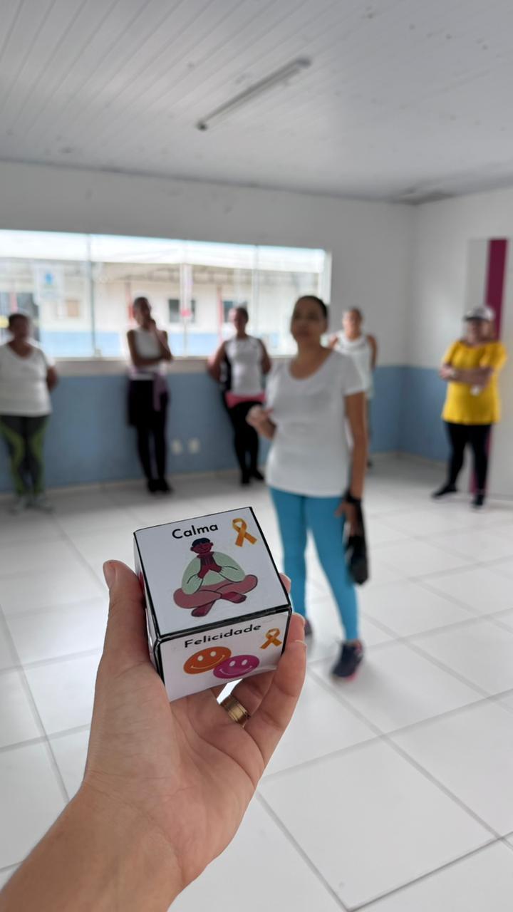 A principal dinâmica foi a construção coletiva do “Mural da Vida”, onde as participantes foram convidadas a refletir sobre o que dava sentido às suas rotinas e motivava a prática de autocuidado. Palavras como família, amizade, saúde, alegria, paz e socialização surgiram espontaneamente, compondo um retrato coletivo do grupo.