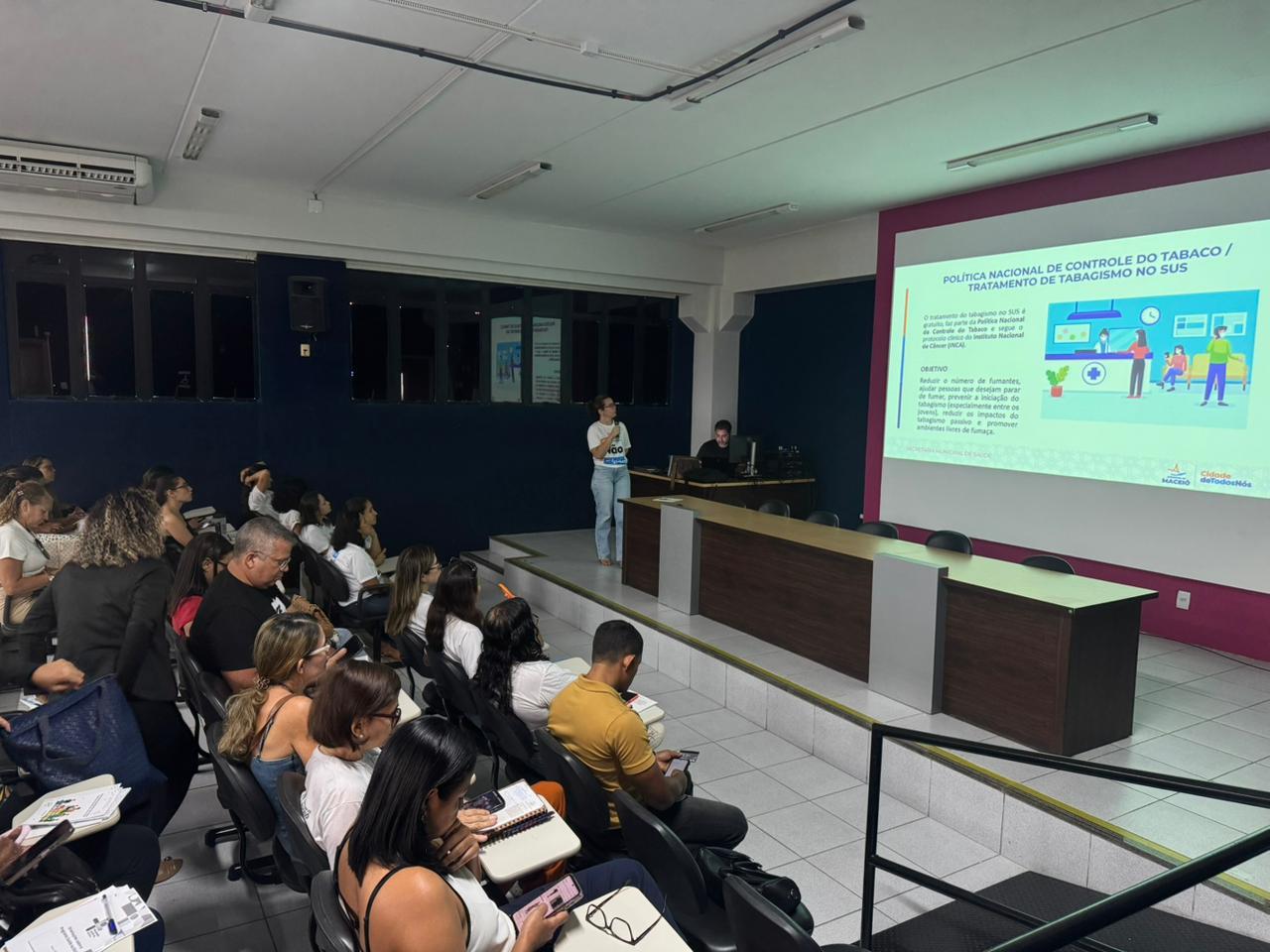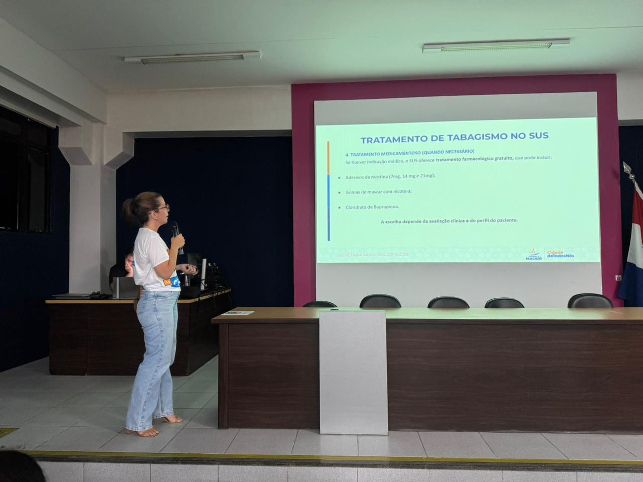 O encerramento da formação ficou sob responsabilidade de Laís Porangaba, técnica do Programa Municipal de Controle do Tabagismo, que apresentou os centros disponíveis, explicou como os usuários podem aderir e destacou a relevância do trabalho preventivo e educativo no enfrentamento ao tabagismo em Maceió.