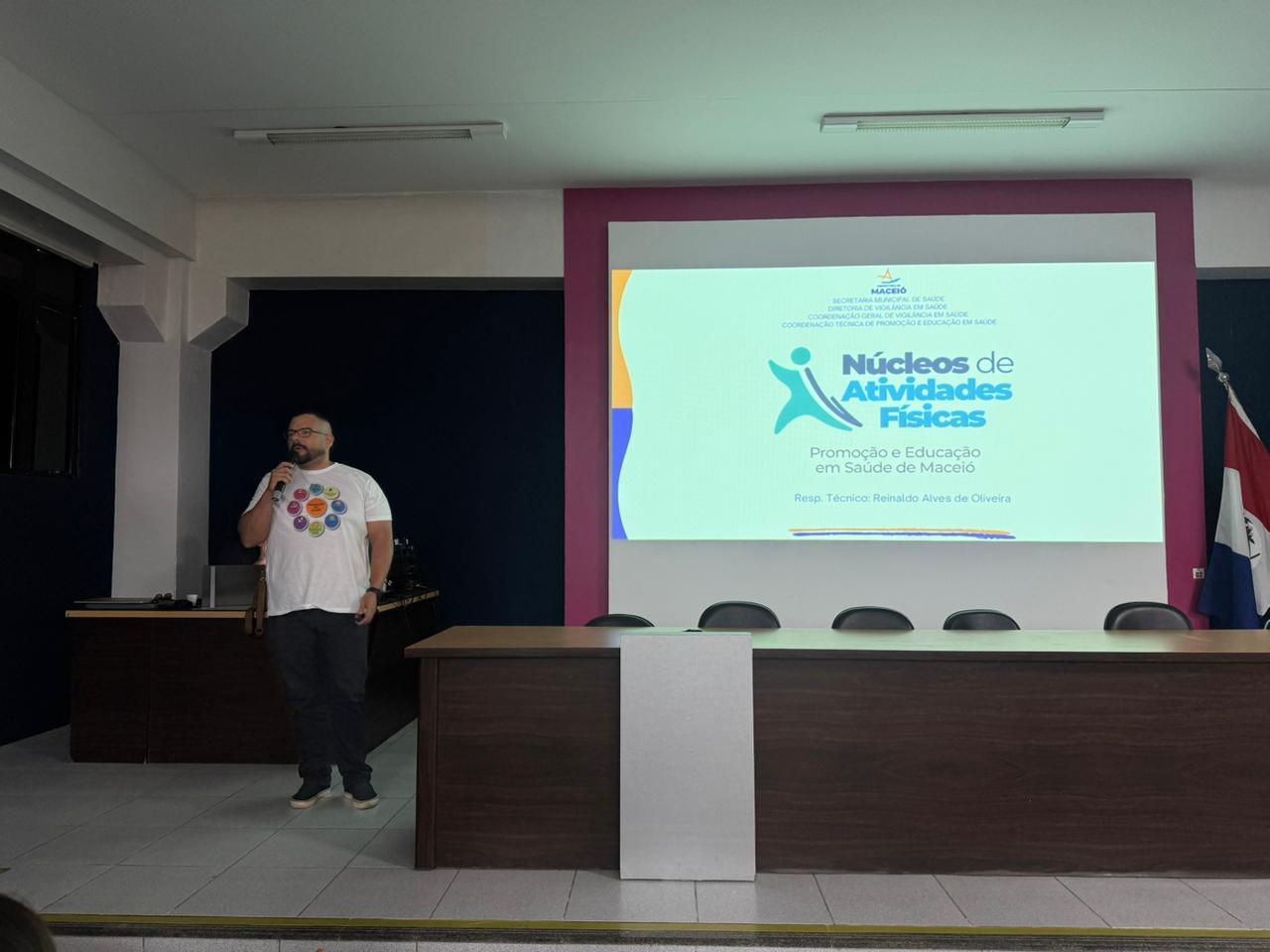 O responsável técnico pelos Núcleos de Atividades Físicas, Reinaldo Alves, iniciou as apresentações e detalhou a função dos Núcleos de Atividades Físicas, explicando o trabalho integrado entre profissionais de Educação Física e os agentes de saúde. Ele ressaltou que essa integração fortalece o vínculo com os usuários, aumenta a adesão às atividades, melhora a saúde física e mental da população, potencializa a atuação das equipes de Saúde da Família, amplia as ações de promoção da saúde dentro e fora das Unidades Básicas de Saúde e estimula a autonomia da população nas práticas de autocuidado.