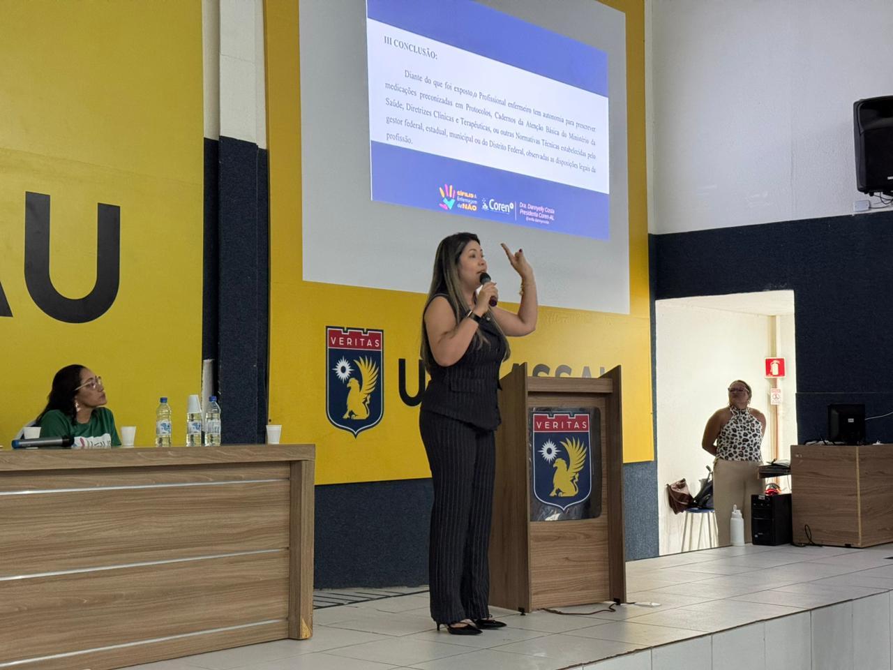 Encerrando a programação, a terceira mesa trouxe o tema “Compromissos coletivos no enfrentamento da sífilis”, com a presidenta do Coren-AL, Dannyelly Costa, e as enfermeiras Hillary Gabriela e Dayana Tenório, que abordaram a administração da penicilina e a linha de cuidado da sífilis, reforçando a importância da atuação integrada entre os serviços de saúde.