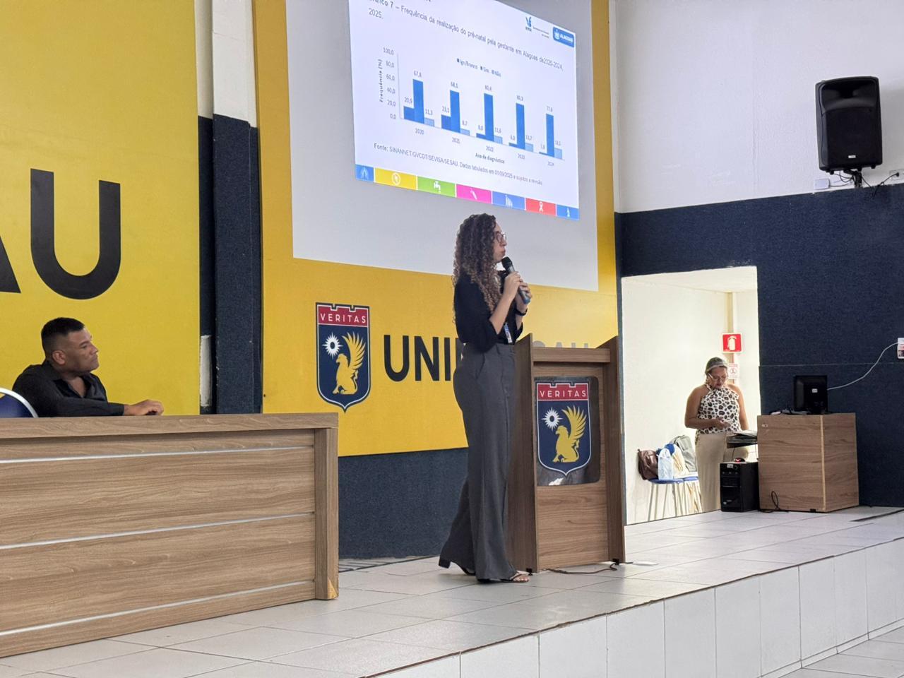 A primeira mesa abordou “A importância da notificação oportuna e da vigilância para prevenção de óbitos”. A palestrante Hillary Gabriela, referência técnica da sífilis na Sesau/AL apresentou o Perfil Epidemiológico do estado, enquanto técnicos da Vigilância Epidemiológica do município de Maceió, Rita Mendonça e Eromir Francisco, debateram os desafios da vigilância do óbito por sífilis.