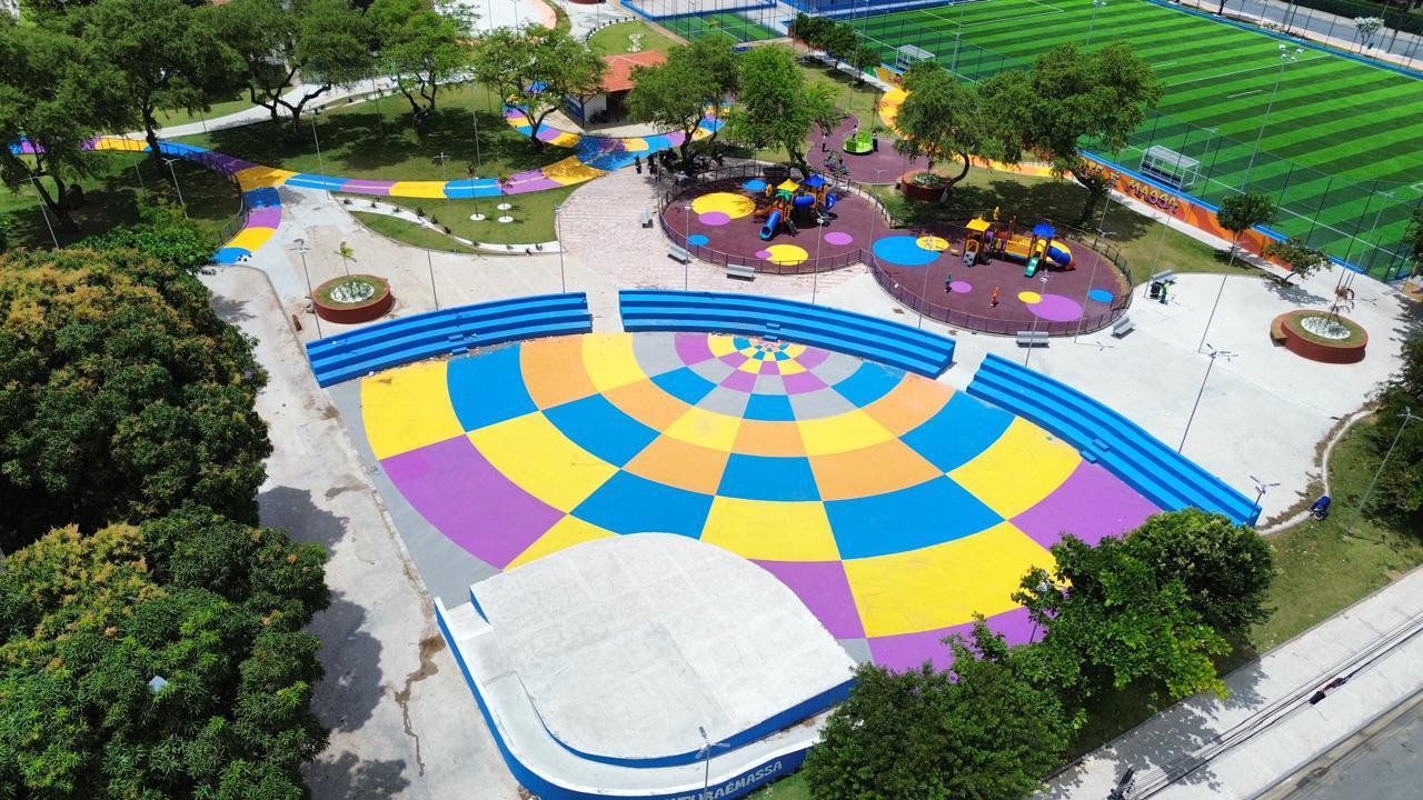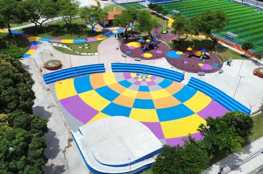 Pensando nisso, foram desenvolvidos projetos de paisagismo, o sistema elétrico foi aprimorado, um espaço saúde foi criado, foram integrados bancos mais modernos, e construídos um palco interativo, uma areninha e uma mini areninha, duas quadras de areia, e as duas quadras poliesportivas foram reformadas, foram instalados um espaço pet, um playground com brinquedos modernos, além da academia do povo com cooper, o espaço saúde e a futmesa.